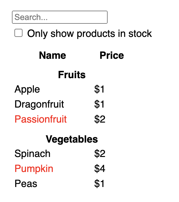 이제 애플리케이션이 어떻게 동작하는지 알 수 있습니다. filterText의 초깃값을 useState('')에서 useState('fruit')로 수정해 보세요. 검색창과 데이터 테이블이 모두 업데이트됨을 확인할 수 있습니다.
